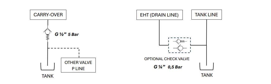 - Ak máte v hydraulickej línii dva ventily, pripojte výstup carry-over z prvého ventilu na tlakový vstup druhého ventilu.