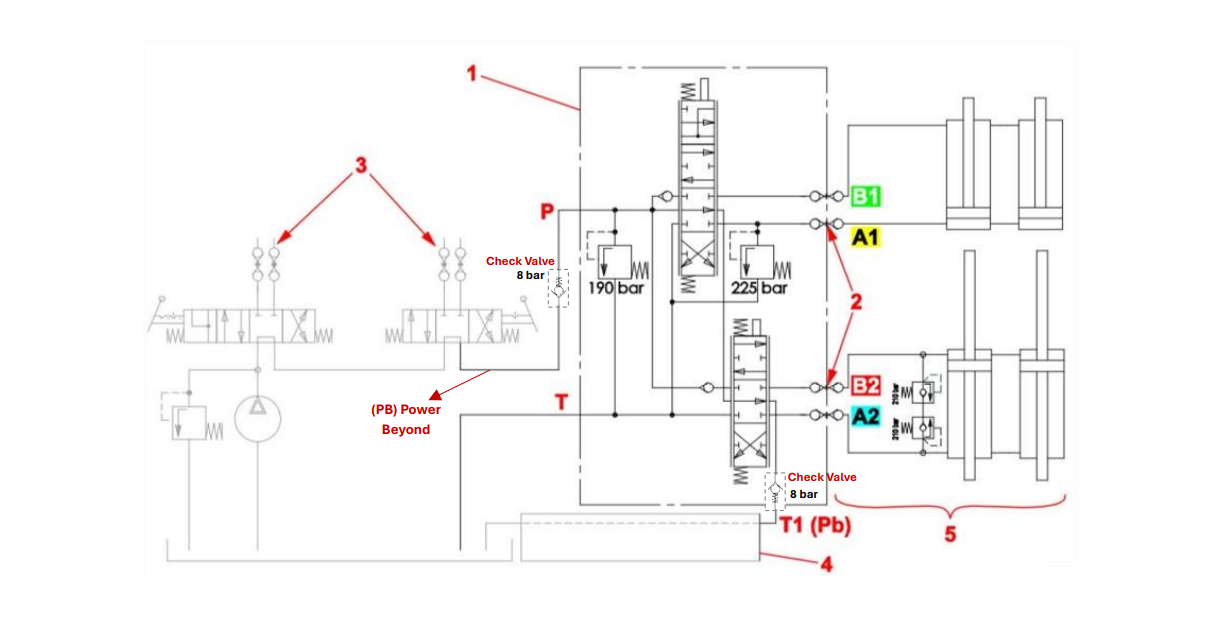- T1 – tlakové prepojenie (Power Beyond – „PB“) + 8 bar pružinový spätný ventil